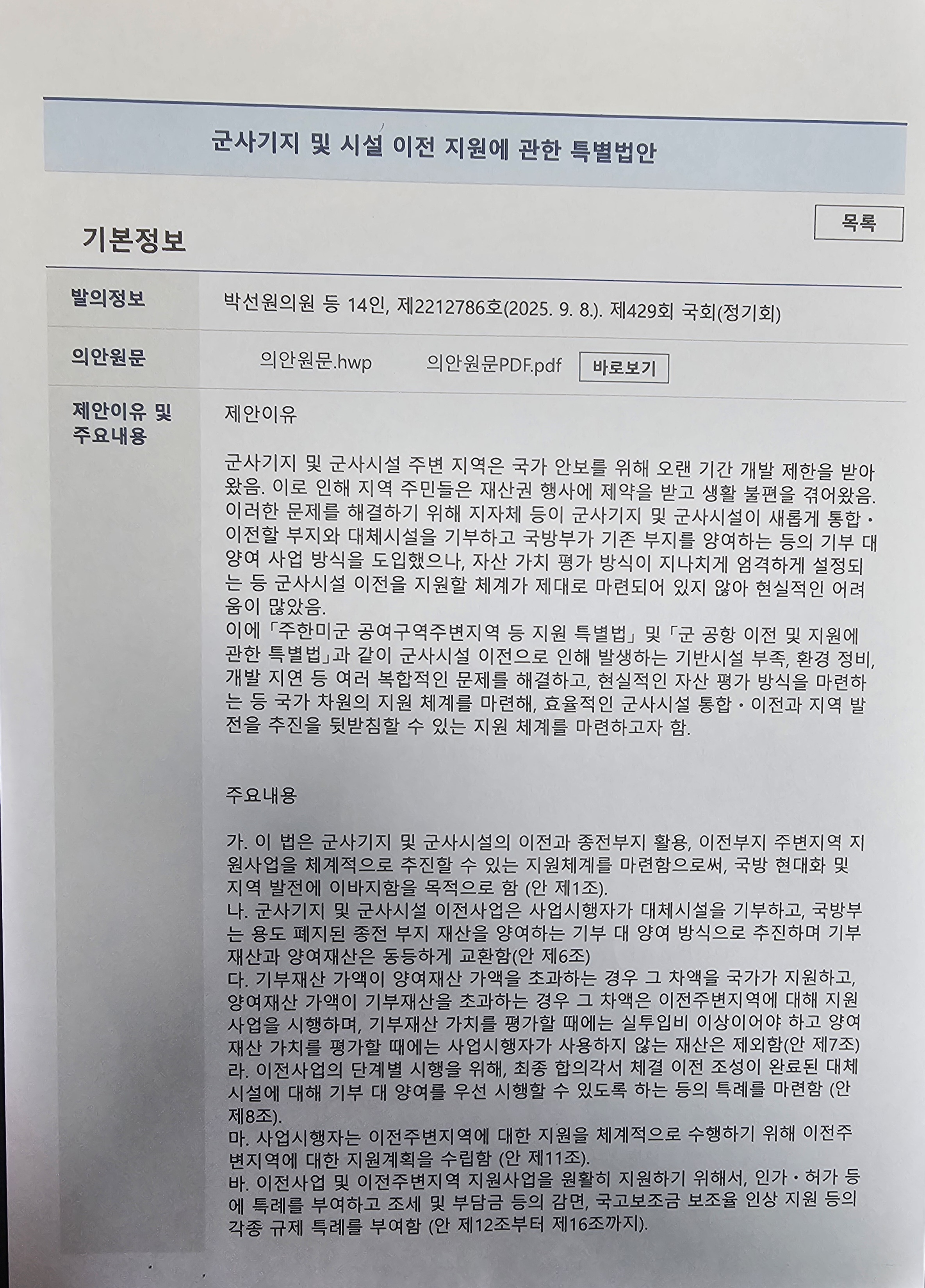 발의 된후 상정도 못하고 폐기된 군부대주변지역 지원을 위한 특별법을 상기하며,