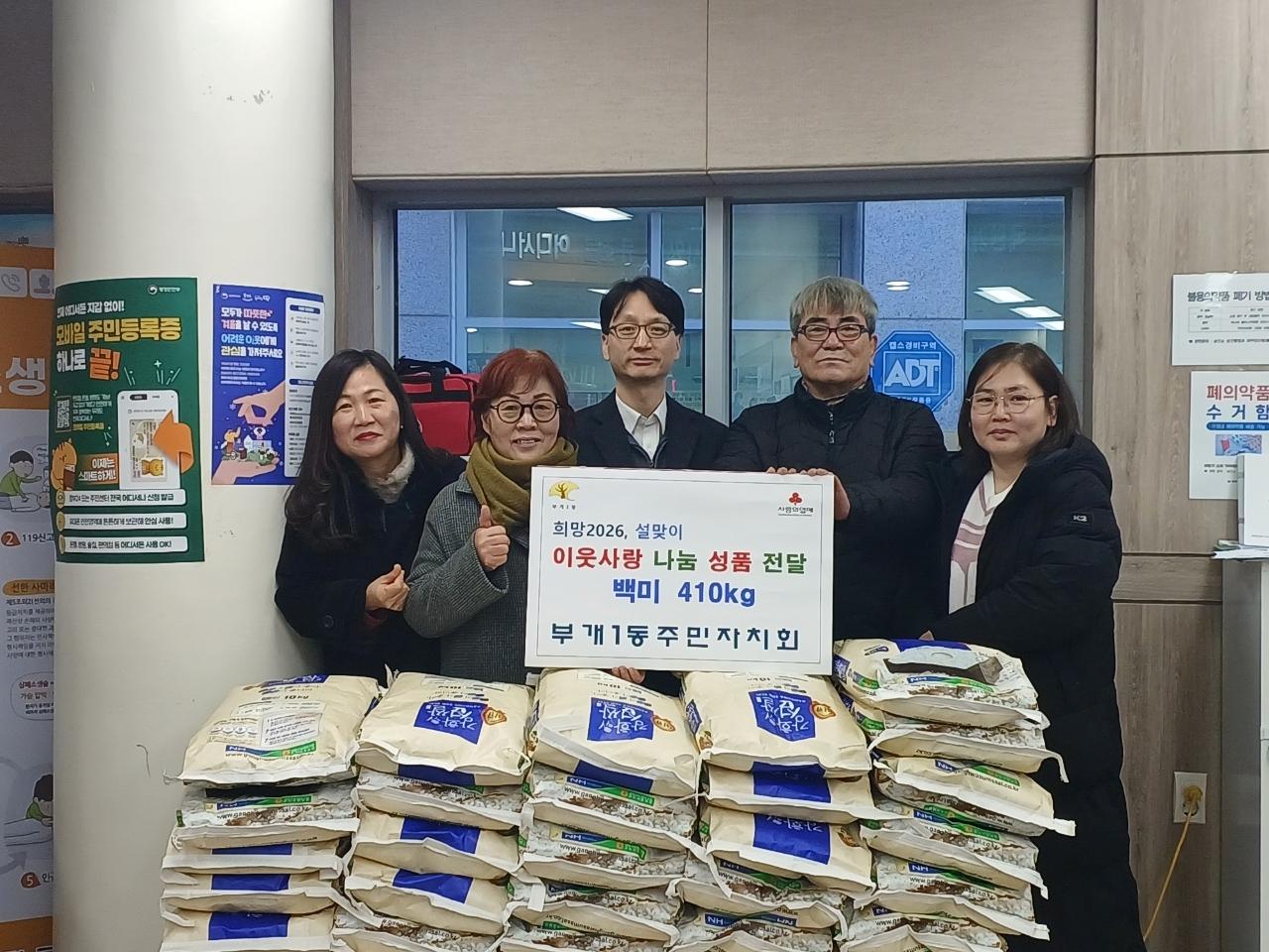 부평구 부개 1 동은 지난 9 일 동 주민자치회로부터 설맞이 이웃사랑 나눔을 위한 쌀 410kg 을 기탁받았다고 밝혔다 .